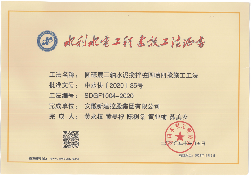 近日,根據(jù)《水利水電工程建設(shè)工法管理辦法》(中水協(xié)[2016]6號(hào))和《關(guān)于開展2020年度水利行業(yè)工法申報(bào)工作的通知》(中水協(xié)[2016]7號(hào))精神,經(jīng)中國(guó)水利工程協(xié)會(huì)組織專家進(jìn)行綜合評(píng)審,我公司申報(bào)的“圓礫層三軸水泥攪拌樁四噴四攪施工工法”順利通過(guò)2020年度水利行業(yè)工法評(píng)審,獲得水利水電工程建設(shè)工法證書!