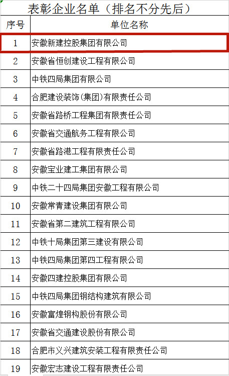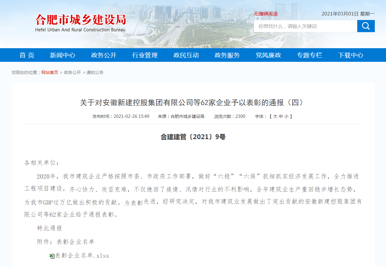 2月26日,合肥市城鄉(xiāng)建設(shè)局印發(fā)《關(guān)于對安徽新建控股集團(tuán)有限公司等62家企業(yè)予以表彰的通報(四)》(合建建管[2021]9號)紅頭文件,對安徽新建控股集團(tuán)有限公司等62家企業(yè)在2020年面對疫情、汛期的不利影響,全力推進(jìn)工程項目建設(shè),為我市GDP過萬億做出的積極貢獻(xiàn)進(jìn)行通報表彰,安徽新建控股集團(tuán)有限公司在該批次表彰中名列榜首。