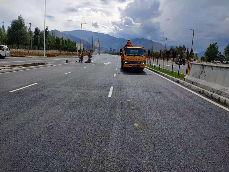 在施工過(guò)程中,項(xiàng)目部技術(shù)人員對(duì)施工班組進(jìn)行詳細(xì)的安全和技術(shù)交底,標(biāo)線按設(shè)計(jì)要求使用熱熔反光涂料,涂料中混合占總重 18~25%的玻璃微珠,在噴涂時(shí)標(biāo)線表面均布 0.3~0.4kg/m2 的玻璃微珠,在試撒合格后正式開(kāi)始施工,經(jīng)一周緊鑼密鼓的安排與施工人員的努力下,路面標(biāo)線全面完成施工。