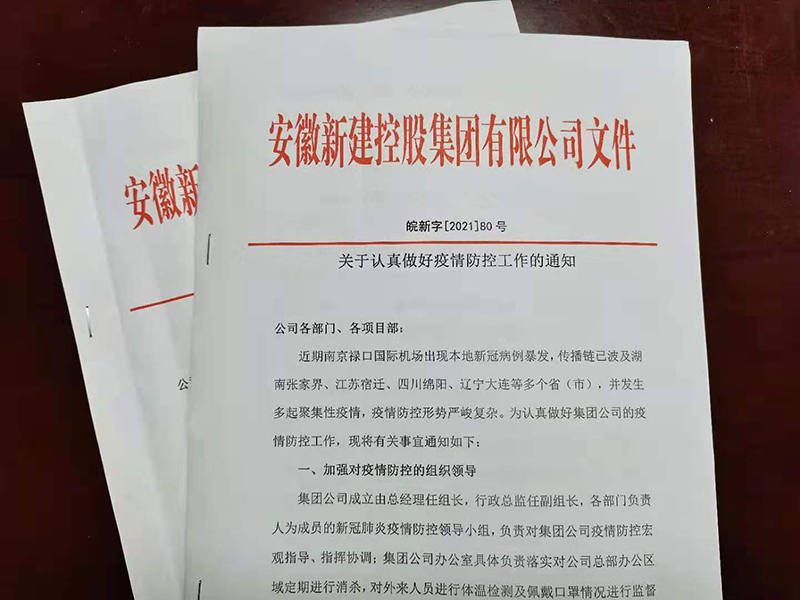 7月30日,安徽新建控股集團(tuán)針對(duì)近期全國疫情防控的嚴(yán)峻形勢,研究制定并印發(fā)《關(guān)于認(rèn)真做好疫情防控工作的通知》文件,要求公司各單位要加強(qiáng)對(duì)疫情防控的組織領(lǐng)導(dǎo),嚴(yán)格落實(shí)疫情防控的相關(guān)措施,認(rèn)真做好常態(tài)化的疫情防控工作。