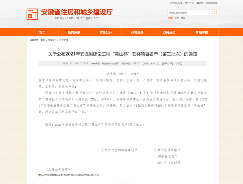 11月17日,安徽省住房和城鄉(xiāng)建設(shè)廳發(fā)布2021年安徽省建設(shè)工程"黃山杯"獲獎(jiǎng)項(xiàng)目名單。安徽新建控股集團(tuán)承建的合肥高新區(qū)復(fù)興路(創(chuàng)新大道——石蓮南路)、菖蒲路(長寧大道——三星東支路)、三星東支路(菖蒲路——銘傳路)道排及附屬工程項(xiàng)目榜上有名。