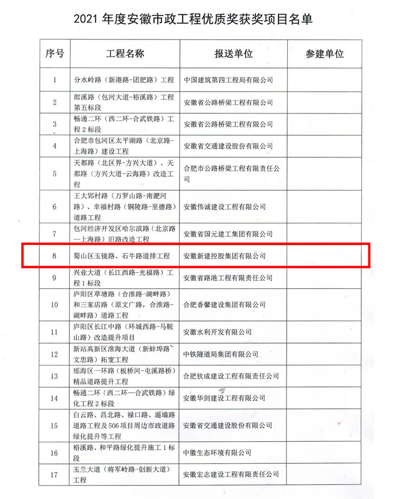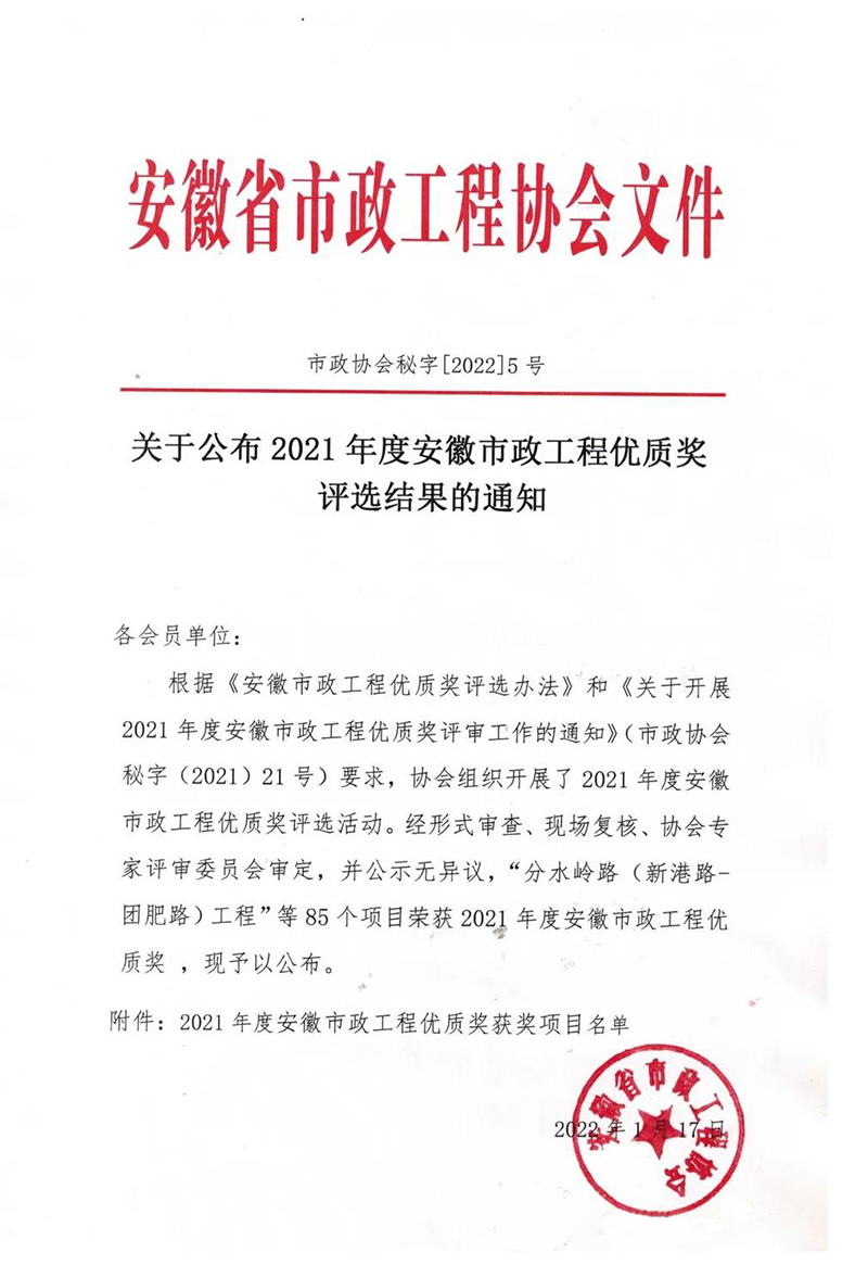 2022年1月17日,安徽省市政工程協(xié)會公布了2021年度安徽省市政工程優(yōu)質(zhì)獎評選結(jié)果的通知,經(jīng)形式審查、現(xiàn)場復(fù)核、協(xié)會專家評審委員會審定,并公示無異議,安徽新建控股集團(tuán)有限公司承建的四項工程榮獲“2020年度安徽省市政工程優(yōu)質(zhì)獎”!