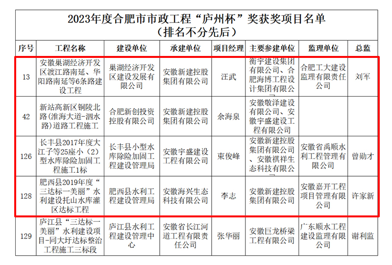 9月6日,合肥市市政工程協(xié)會(huì)官網(wǎng)發(fā)布了《關(guān)于公布2023年度合肥市政工程“廬州杯”獎(jiǎng)獲獎(jiǎng)項(xiàng)目名單的通知》,安徽新建控股集團(tuán)承建、參建的四個(gè)項(xiàng)目榮獲2023年度合肥市市政工程“廬州杯”獎(jiǎng)。