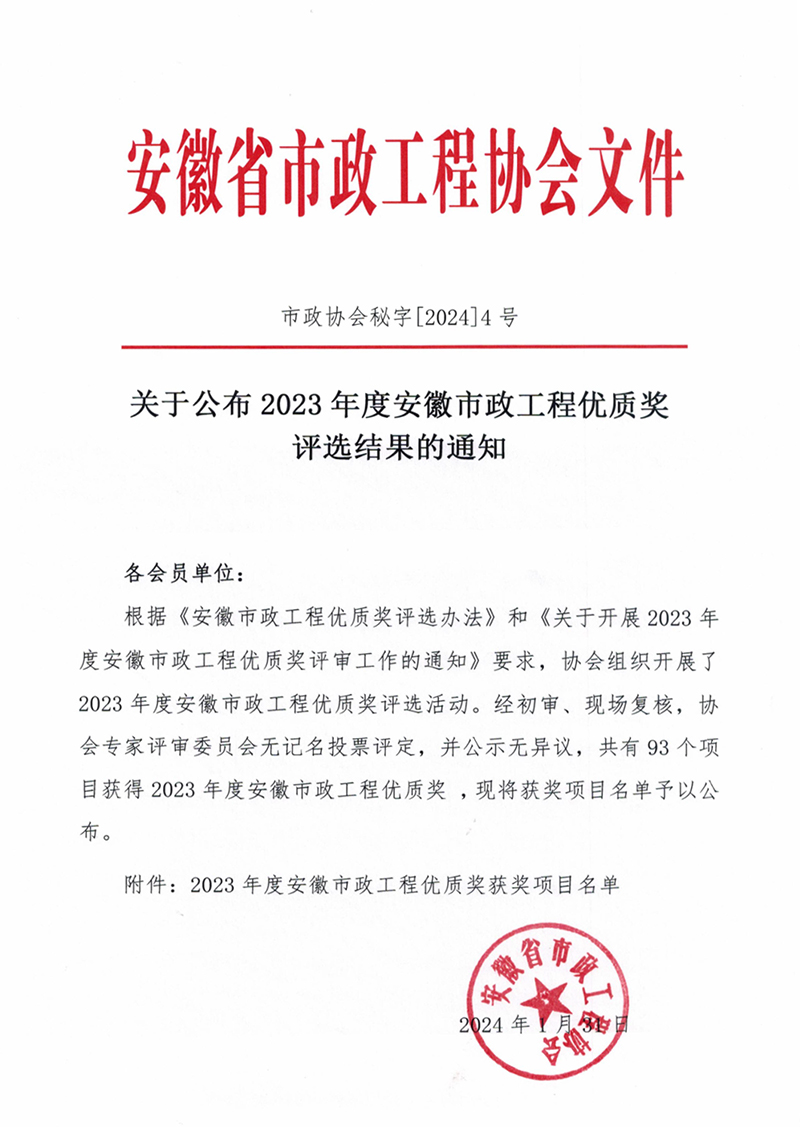 1月31日,安徽省市政工程協(xié)會公布關(guān)于“2023年度安徽省市政工程優(yōu)質(zhì)獎”評選結(jié)果的通知,集團公司承建的安徽巢湖經(jīng)濟開發(fā)區(qū)渡江路南延、華陽路南延等6條路建設(shè)工程、碭山縣城市防洪排澇設(shè)施建設(shè)工程項目-生態(tài)調(diào)蓄綜合子項目EPC工程、新站高新區(qū)銅陵北路(淮海大道泗水路)道路工程施工、濠州路、淮河大道和郭圩路三條道路延伸段工程、黟縣豐溪河良好水體保護與生態(tài)修復(fù)工程epc等5項工程榮獲2023年度安徽省市政工程優(yōu)質(zhì)獎獎項。