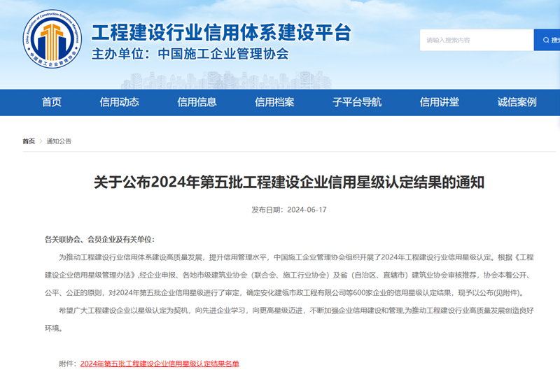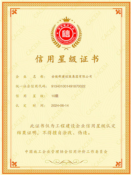 6月17日,中國施工企業(yè)管理協(xié)會(huì)公布2024年度第五批工程建設(shè)企業(yè)星級(jí)認(rèn)定結(jié)果,在全國第五批參加認(rèn)定的600家企業(yè)中,安徽新建憑借良好的企業(yè)履約行為和信用表現(xiàn),獲得信用星級(jí)十星認(rèn)定。