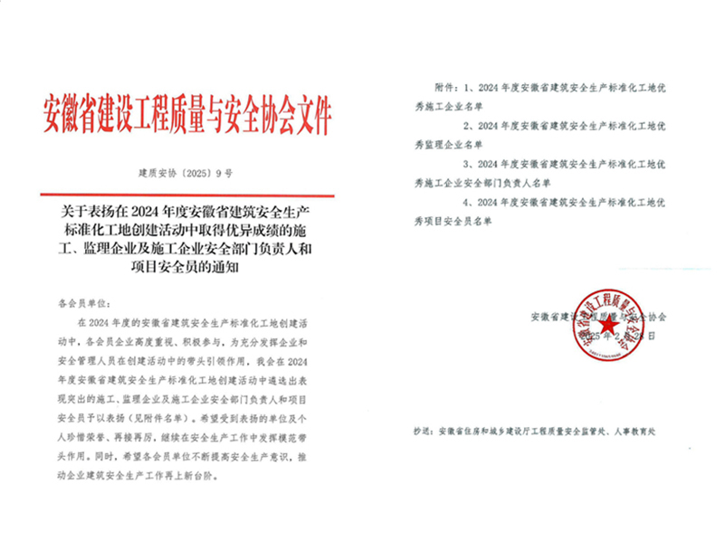 近日,安徽省建設(shè)工程質(zhì)量與安全協(xié)會發(fā)布表揚(yáng)通知,集團(tuán)公司榮獲“安徽省建筑安全生產(chǎn)標(biāo)準(zhǔn)化工地優(yōu)秀施工企業(yè)”稱號,公司多名安全管理人員獲得表彰。