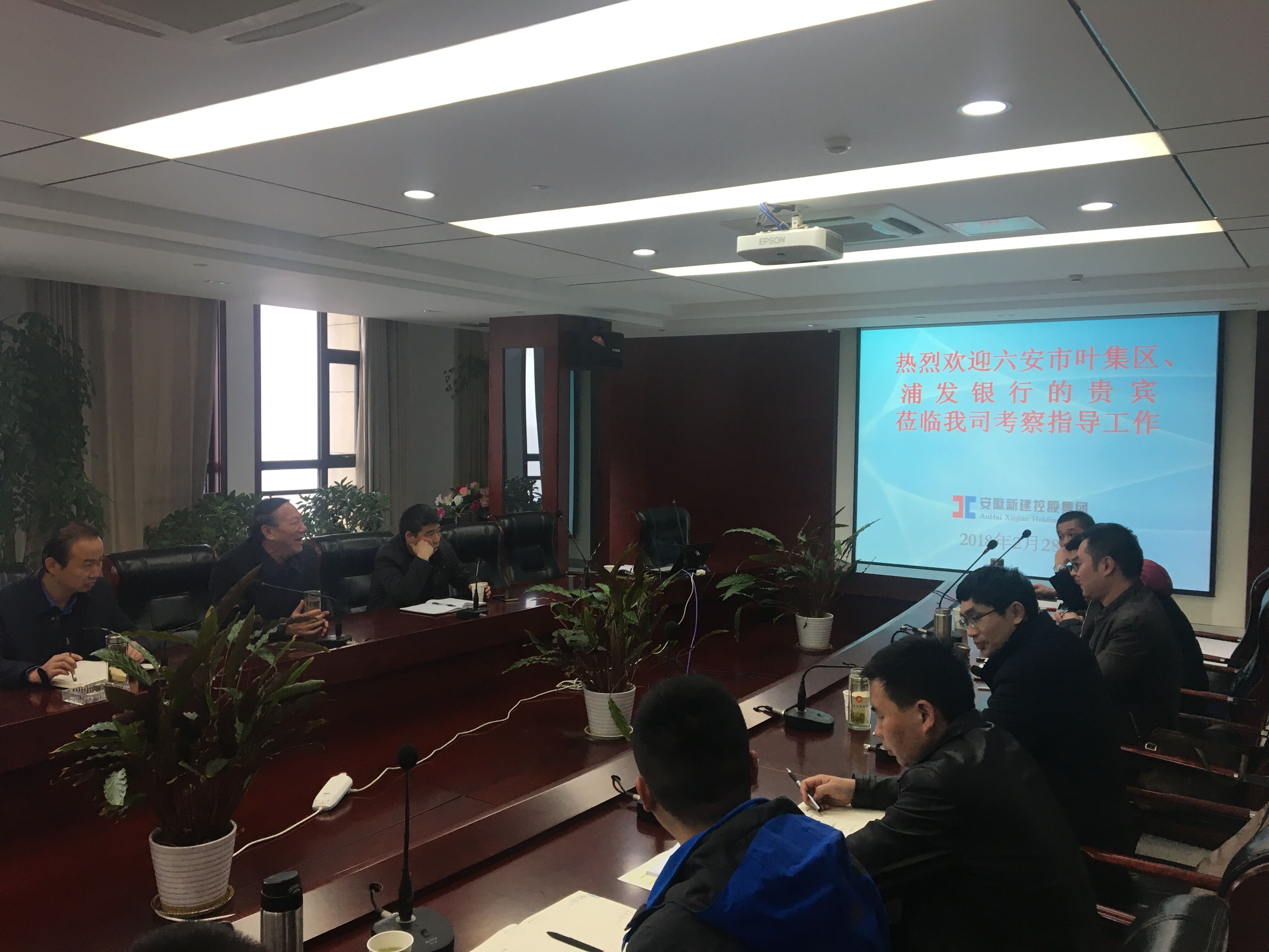 2018年2月28日上午,六安市葉集區(qū)財(cái)政局副局長(zhǎng)邰德煒、浦發(fā)銀行蕪湖分行副行長(zhǎng)熊赟、六安市葉集建設(shè)投資經(jīng)營(yíng)有限責(zé)任公司董事長(zhǎng)王磊等一行來(lái)我公司洽談工程項(xiàng)目融資事宜,安徽新建控股集團(tuán)有限公司董事長(zhǎng)王杰英及相關(guān)領(lǐng)導(dǎo)熱情接待。