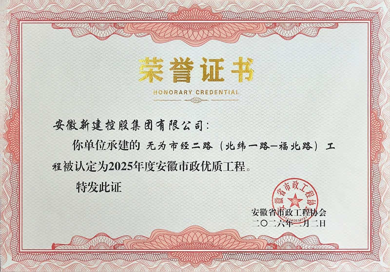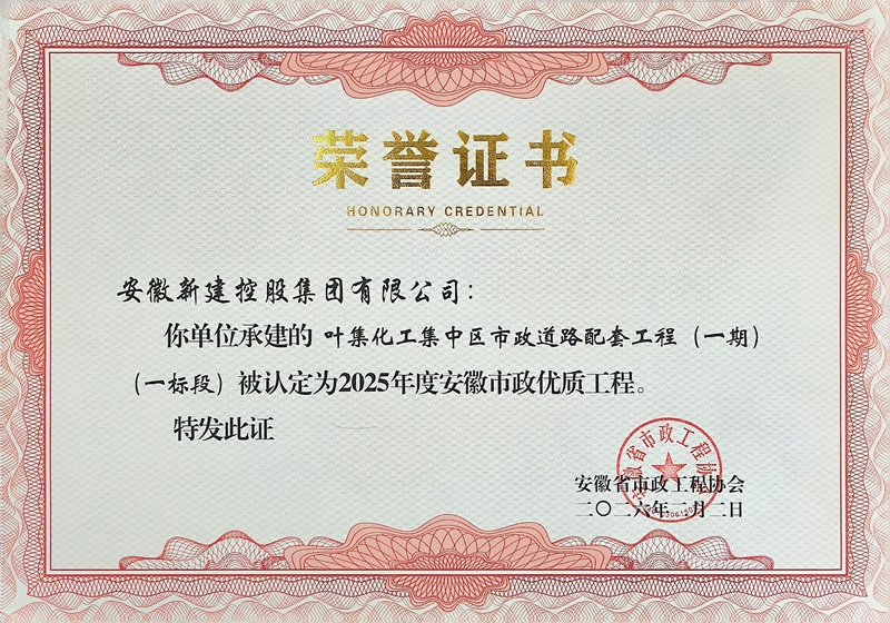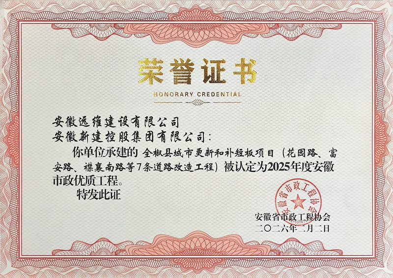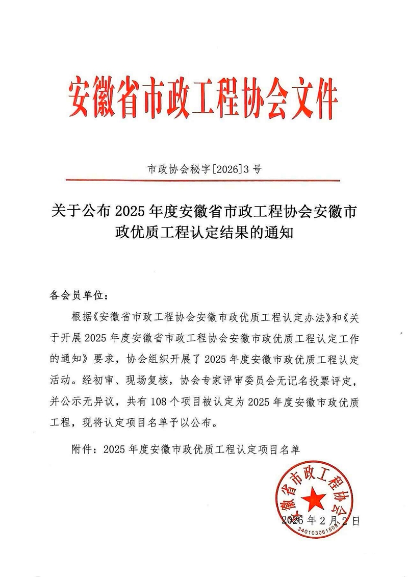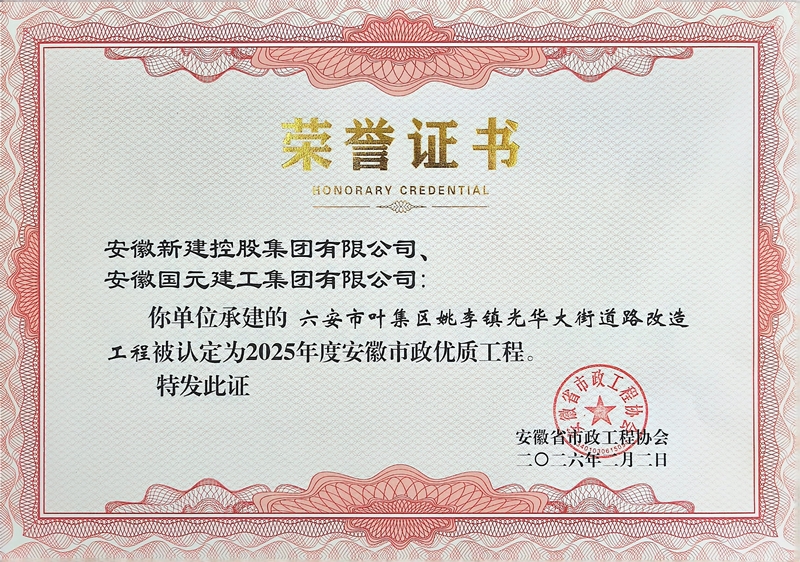 2月2日,安徽省市政工程協(xié)會(huì)公布2025年度安徽市政優(yōu)質(zhì)工程項(xiàng)目名單,集團(tuán)公司承建的四項(xiàng)工程榮獲獎(jiǎng)項(xiàng),分別是:六安市葉集區(qū)姚李鎮(zhèn)光華大街道路改造工程、全椒縣城市更新和補(bǔ)短板項(xiàng)目、葉集化工集中區(qū)市政道路配套工程、無為市經(jīng)二路工程。