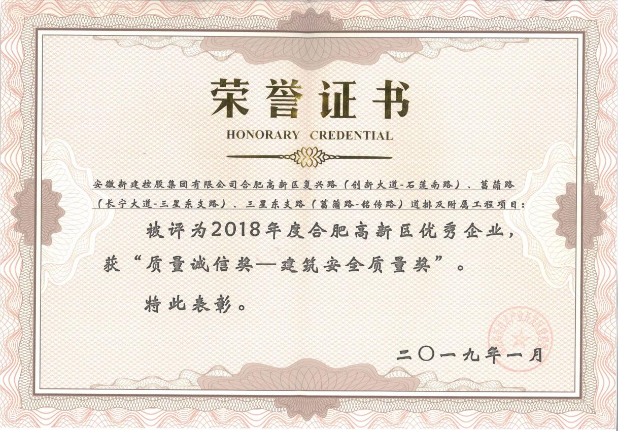 喜報,由我公司承建的合肥高新區(qū)復興路(石蓮南路-創(chuàng)新大道)、菖蒲路(長寧大道-三星東支路)、三星東支路(菖蒲路-銘傳路)道排及附屬工程榮獲“質量誠信獎——建筑安全質量獎”,同時,我公司被評為2018年度合肥高新區(qū)優(yōu)秀企業(yè)。這是本項目繼“廬州杯”和“合肥市市政工程安全文明標準化示范工地”之后獲得的又一殊榮。