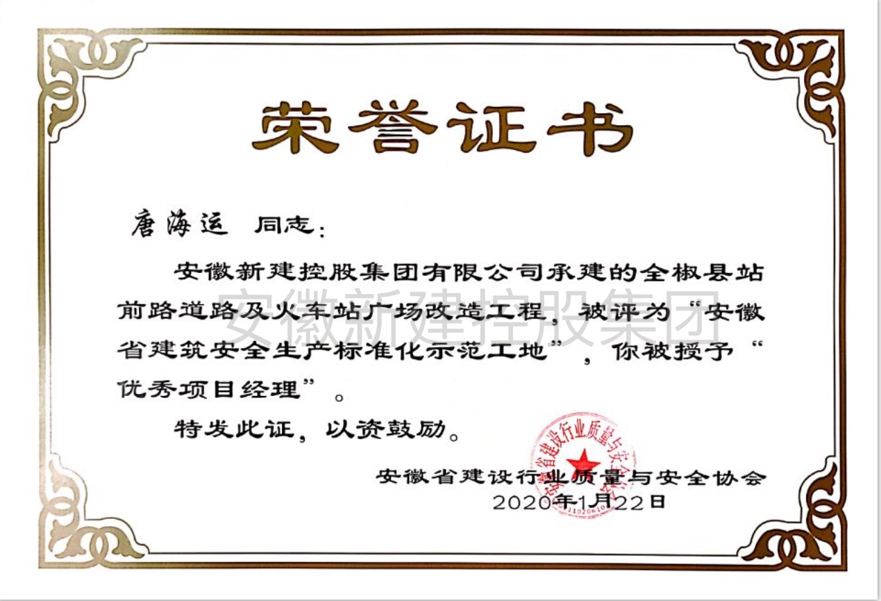 近日,我公司承建的全椒縣站前路道路及火車站廣場改造工程,通過安徽省建設(shè)行業(yè)質(zhì)量與安全協(xié)會(huì)的嚴(yán)格考評(píng),被評(píng)為“安徽省建筑安全生產(chǎn)標(biāo)準(zhǔn)化示范工地”稱號(hào)。唐海運(yùn)獲“優(yōu)秀項(xiàng)目經(jīng)理”稱號(hào)。